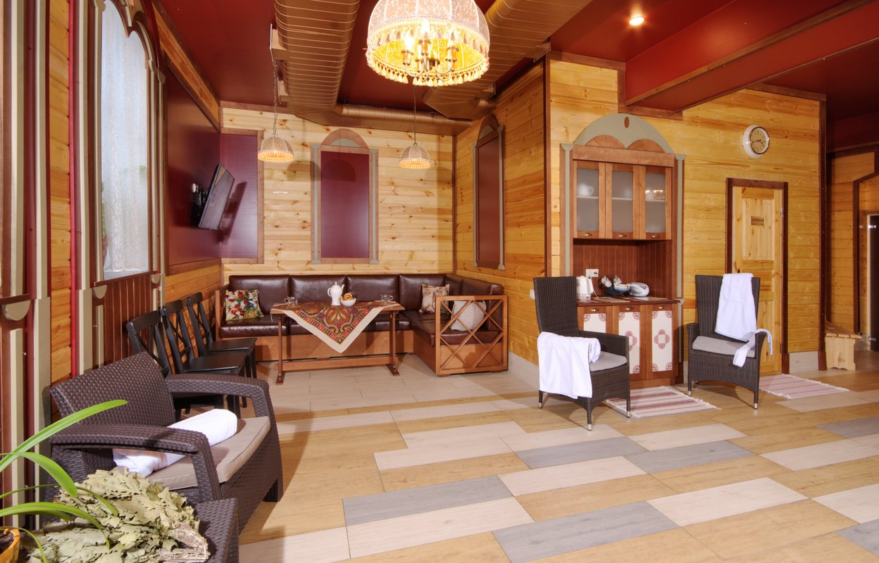 Не хочется в бассейн? Не беда! Вместо этого можно передохнуть в нашей комнате отдыха. Мы ставили своей целью создать здесь уютный, практичный интерьер из преимущественно натуральных, безопасных материалов, подобрать мебель, которая будет в равной степени удобной и красивой. Надеемся, что он придется вам по душе! Также у нас имеется бар, где вы можете приобрести блюда русской кухни. Главное помните, что плотная трапеза незадолго перед посещением парной - это не самая удачная идея, по мнению докторов. А вот после парной можно трапезничать смело!